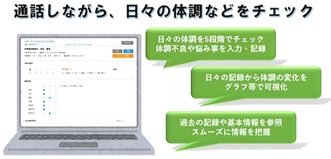 必要な情報を入力・記録し、通話しながら確認できるほか、利用者の健康チエックにも役立ちます。入力情報を利用することで、引き継ぎが効率的に行えます。