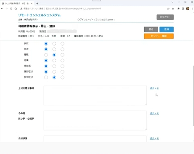 通話の開始は、利用者とコンシェルジュの双方から可能であり、コンシェルジュ側の使用するパソコン画面には、着信のあった利用者の日々の体調等の記録が表示され、基本情報を確認しながらビデオ通話できるなど、コンシェルジュ業務をサポートします。